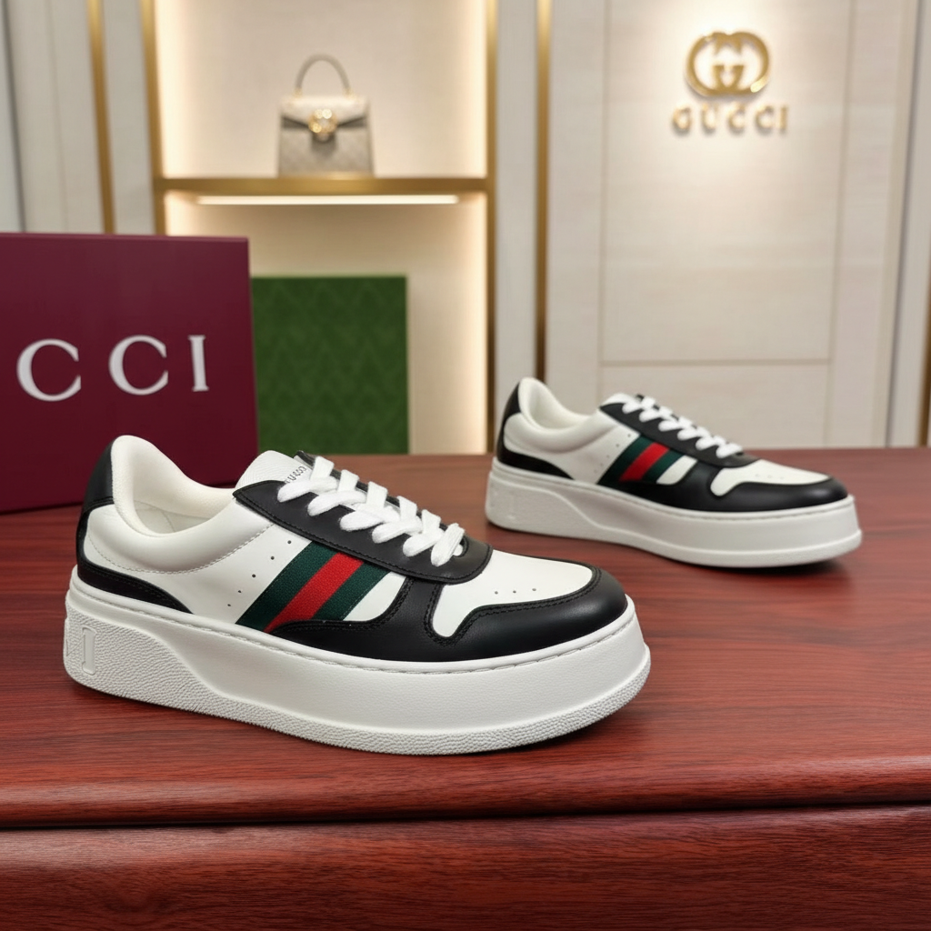 Gucci men’s casual sneakers, stylish black and white leather design with signature green and red stripes, comfortable thick sole for everyday fashion and streetwear.