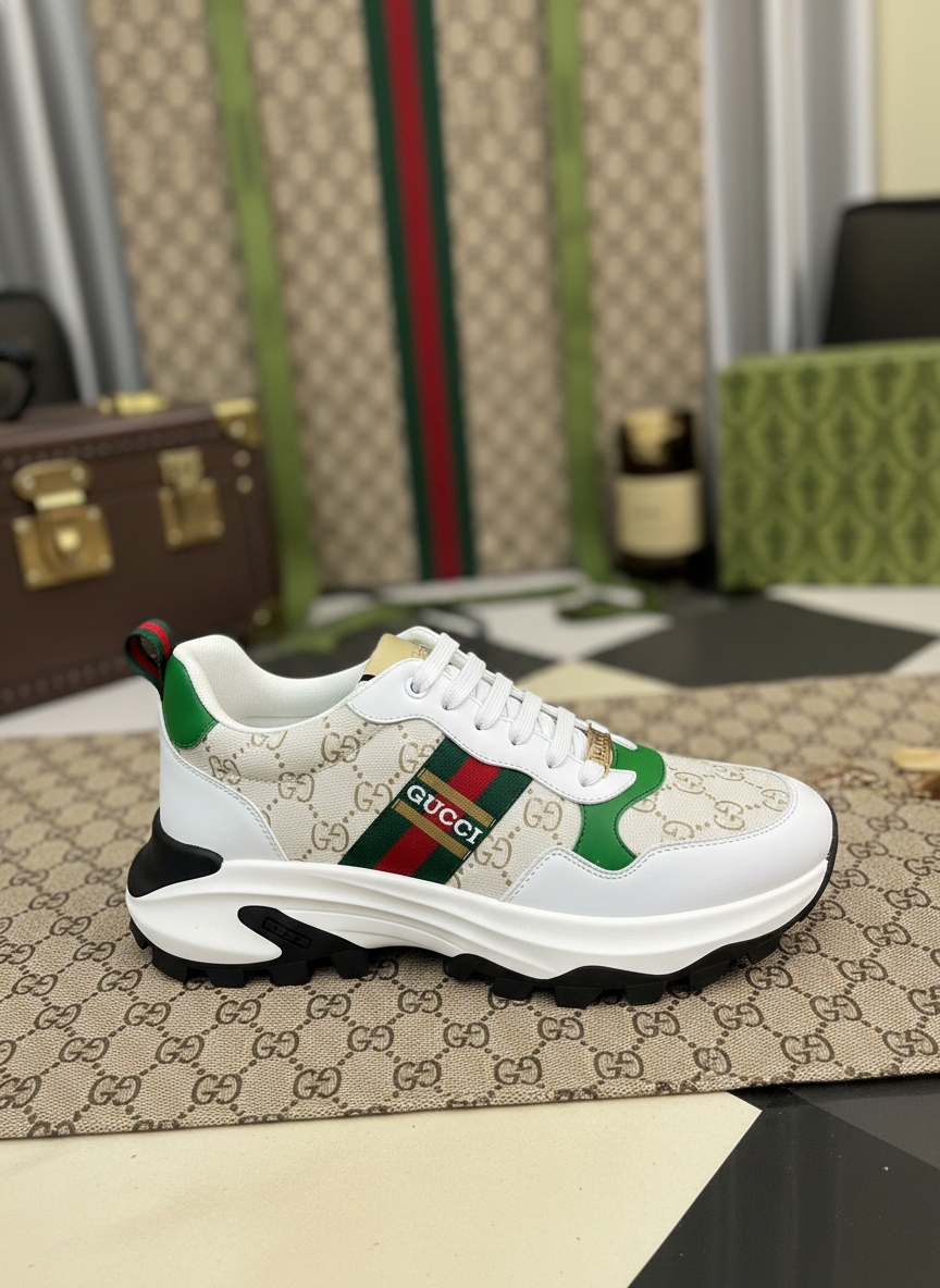 Gucci Men’s Luxury Sneakers, White Green Leather with Signature Monogram Canvas, Fashion Casual Shoes for Streetwear and Sports