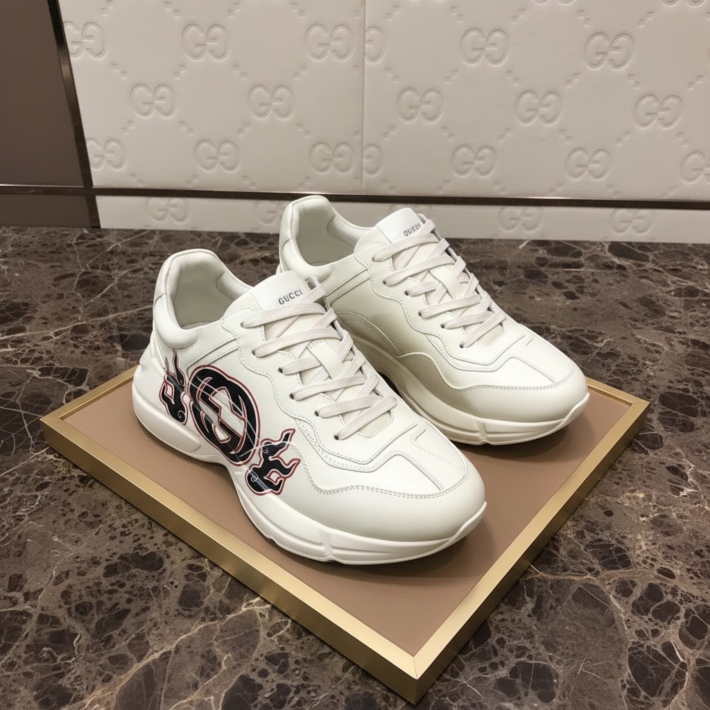 Gucci white leather sneakers with bold logo and flame design, chunky sole, trendy streetwear style, perfect for casual and fashion-forward looks.