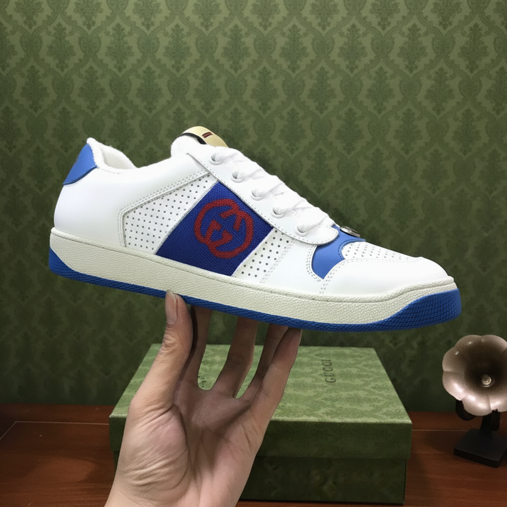 Gucci men’s white leather sneakers with blue accents, perforated sides, and signature red logo, offering premium comfort and stylish casual wear.