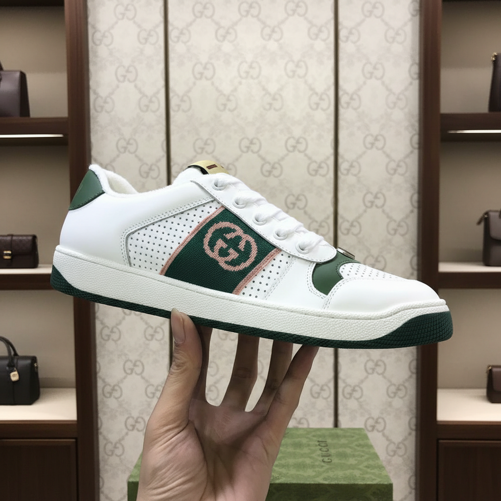 Gucci men’s white leather sneakers with green accents, perforated sides, and signature interlocking GG logo, offering stylish comfort for casual and streetwear looks.
