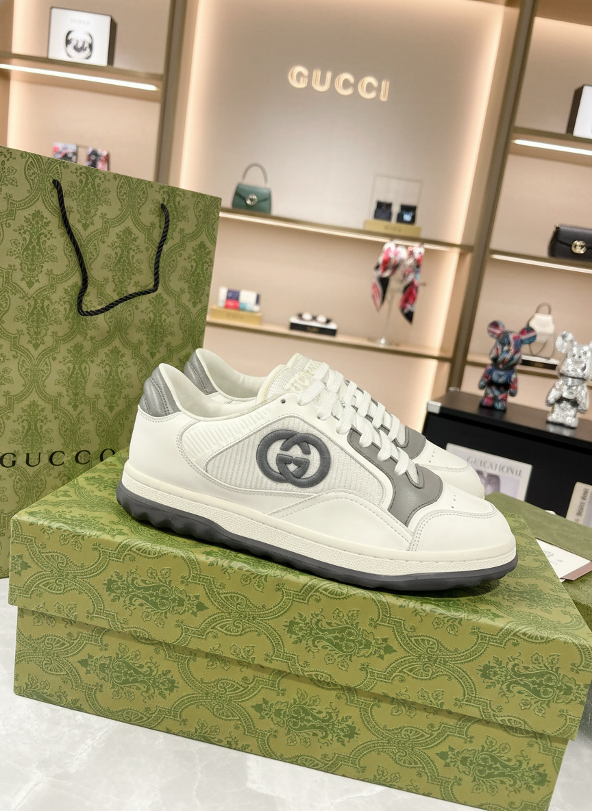 Gucci Men’s White Leather Sneakers with Grey Accents, Signature Interlocking G Logo, Stylish Comfort Casual Shoes for Everyday Wear.