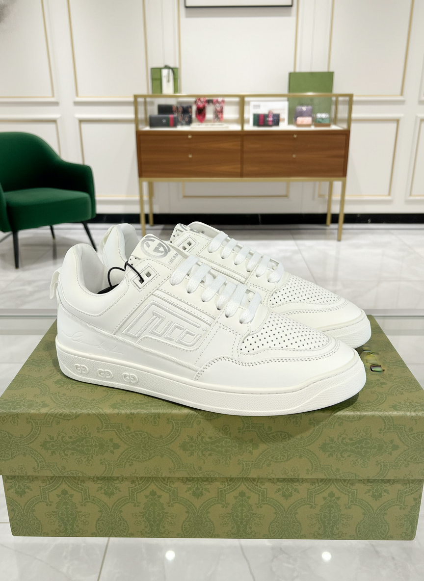Gucci Men’s White Leather Sneakers, stylish low-top design with perforated details, embossed logo accents, and durable rubber sole for everyday comfort and luxury fashion.