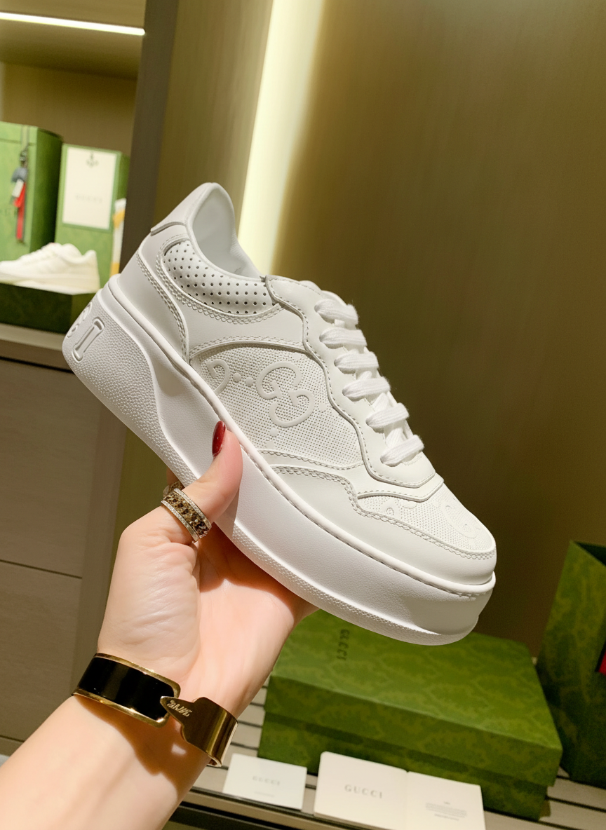 Gucci White Leather Sneakers, stylish low-top design with signature GG logo, breathable perforated details, and chunky sole for comfort and fashion-forward appeal.