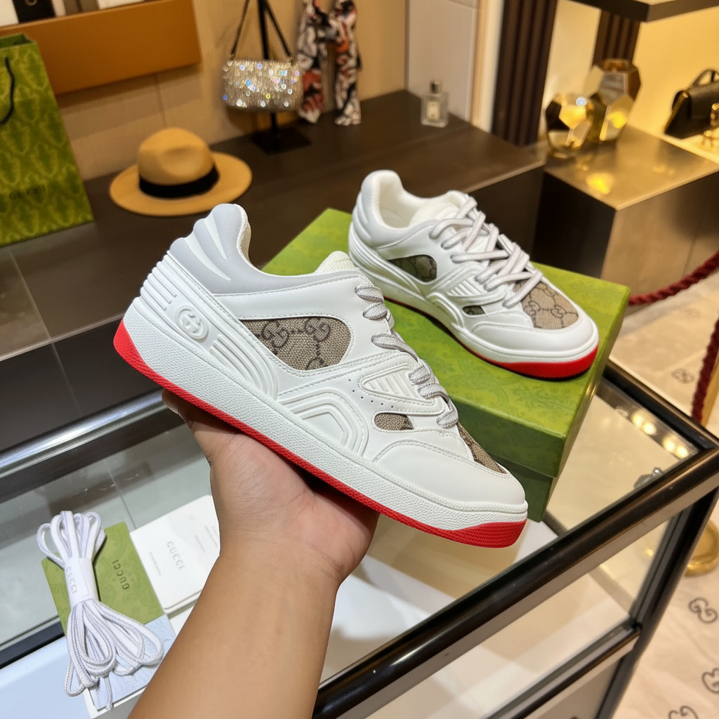Gucci white leather sneakers with signature monogram canvas panels, red rubber sole, and premium craftsmanship for stylish casual wear.