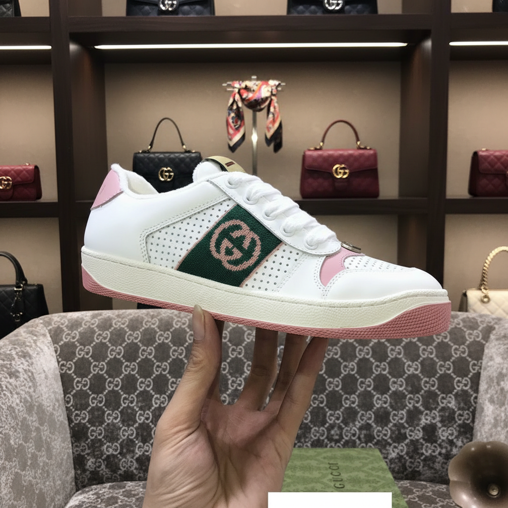 Gucci women’s white leather sneakers with pink accents, green logo detail, perforated sides, and rubber sole, perfect for casual fashion and everyday comfort.
