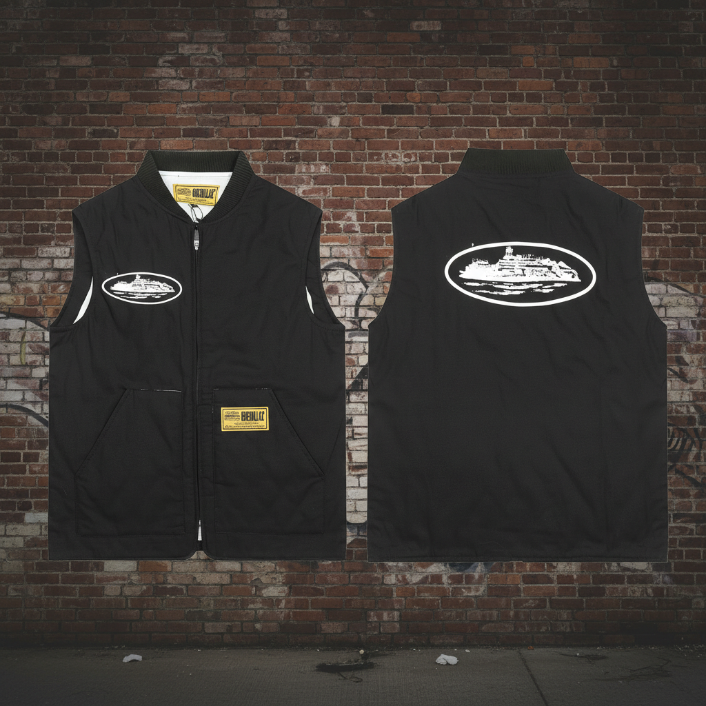 JacketsGuerillaz Men’s Black Work Vest – Durable Sleeveless Jacket with Urban Ship Print, Front Pockets, Full Zip, Streetwear Style for Outdoor and Casual Wear