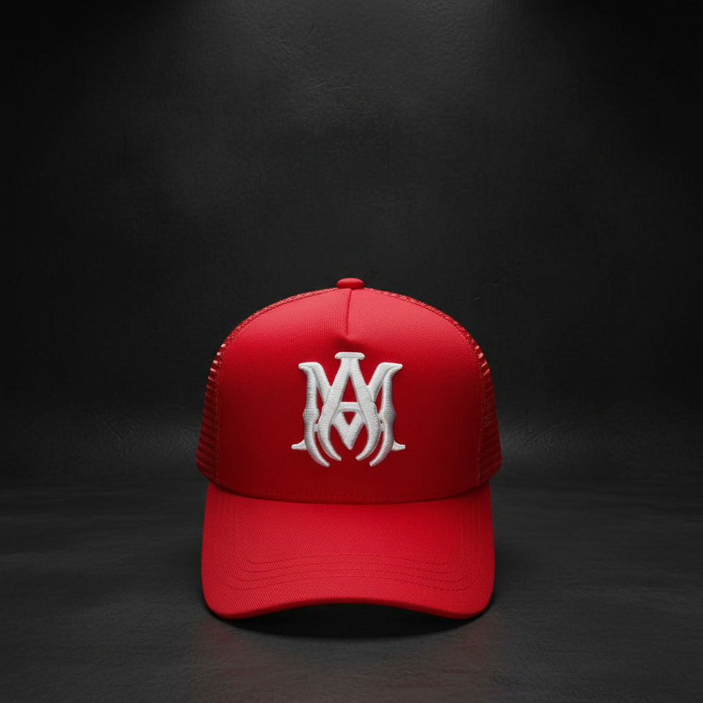 HatsAmiri Red Mesh Baseball Cap with White Embroidered Logo, Adjustable Snapback, Stylish Breathable Hat for Men and Women.