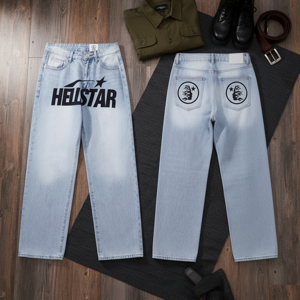 Hellstar Acid Wash Blue Wide-Leg Jeans – Unisex Streetwear