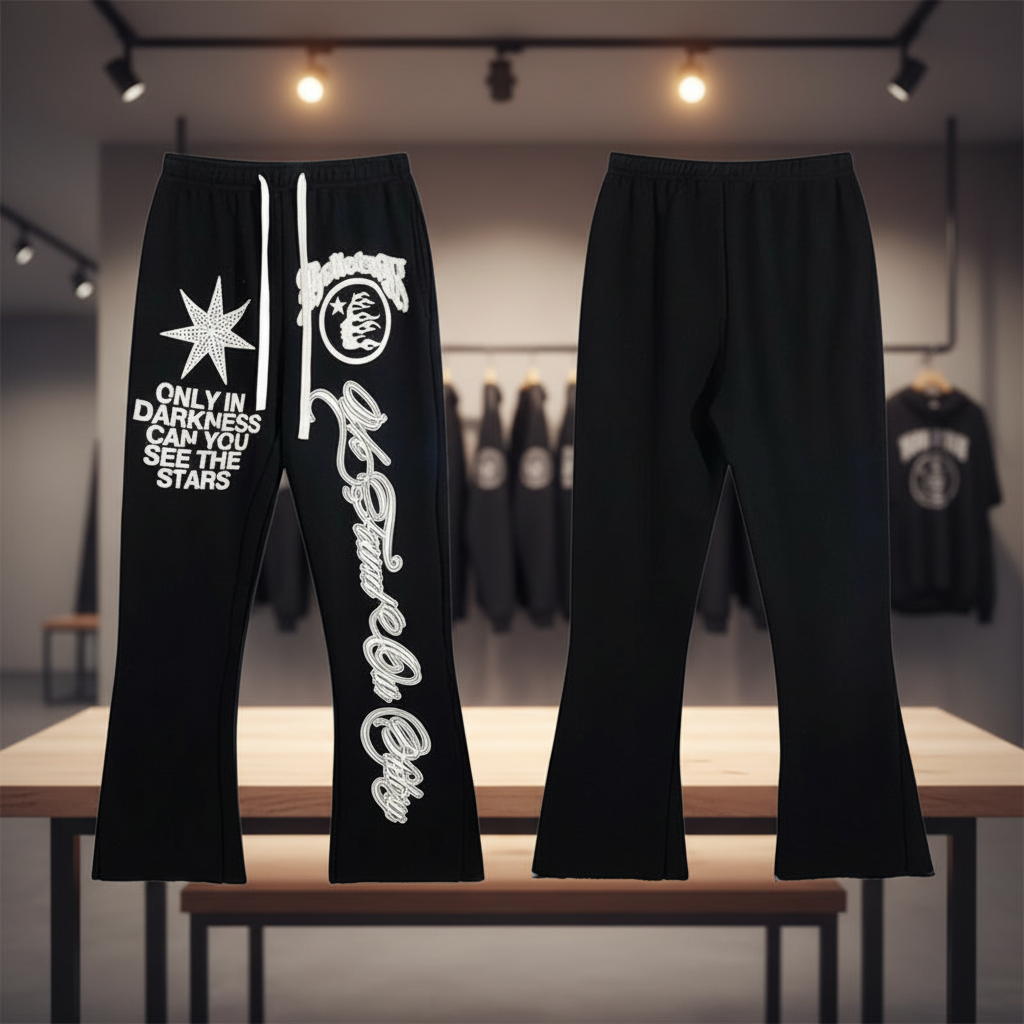 Hellstar Black Cotton Flare Pants – Embroidered Unisex Streetwear