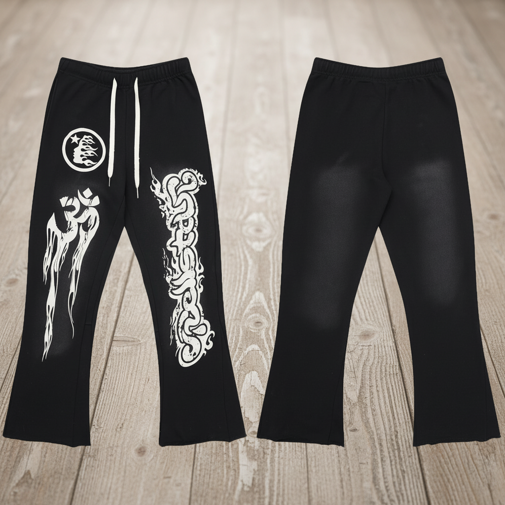 / Hellstar Black Flare Pants: Flame Print, Cotton, Unisex