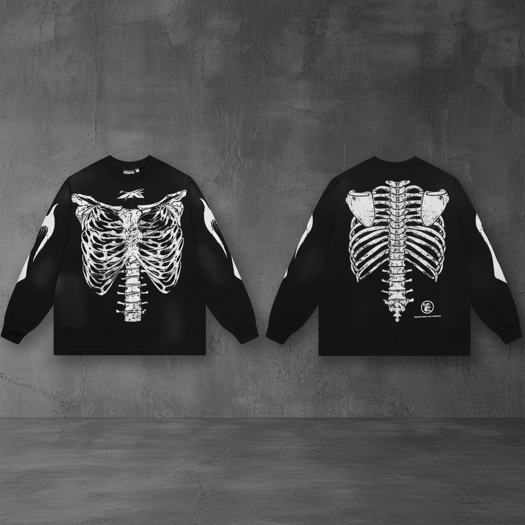 / Hellstar Black Long Sleeve Tee: Skeleton & Flame Print Unisex Streetwear Top