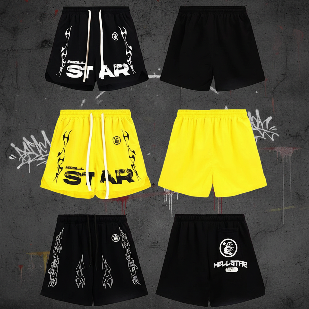 Hellstar men’s casual flame print shorts, streetwear style, breathable summer beach sport pants, available in black and yellow.