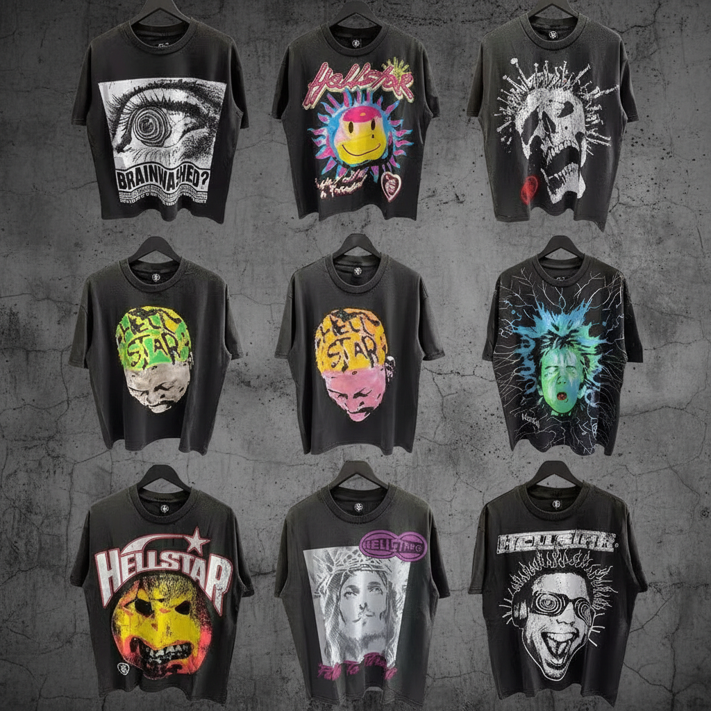 Hellstar graphic print T-shirt, streetwear style with edgy skull, eye, and abstract designs, perfect for casual wear and making a bold fashion statement.