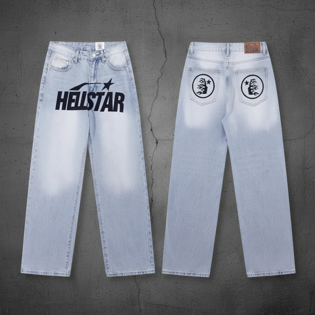Hellstar Light Blue Wash Straight Jeans with Flame & Star Design