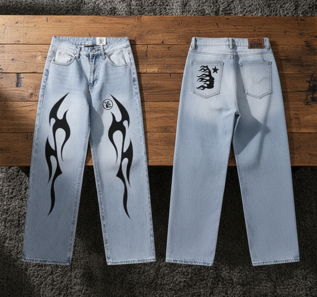 Hellstar Light Blue Washed Jeans – Flame Graphic Streetwear