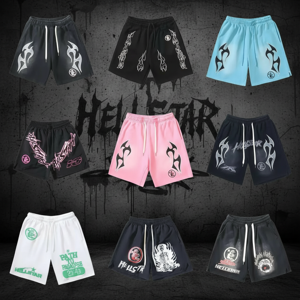 Hellstar stylish graphic shorts, breathable cotton, trendy streetwear design, perfect for summer, skate, hip-hop and casual outfits, available in multiple colors and prints.