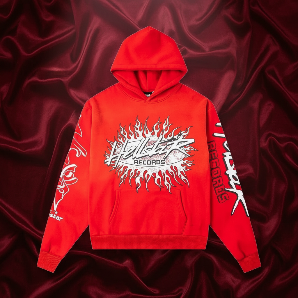 Hellstar Red Fleece Hoodie: Vintage Wash Flame Graphic Streetwear