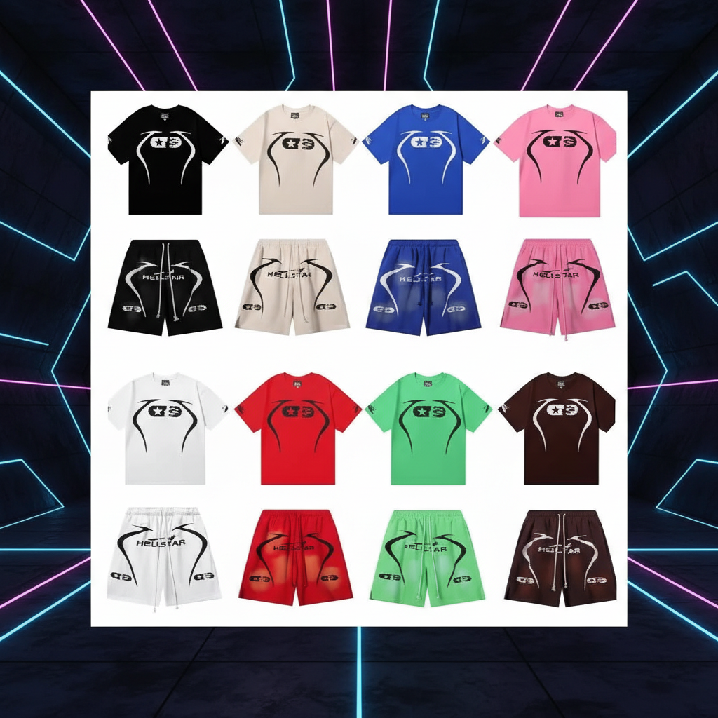 Hellstar T-Shirt and Shorts Set, trendy streetwear in multiple colors, premium fabric, bold graphic design, perfect for casual wear and urban fashion lovers.