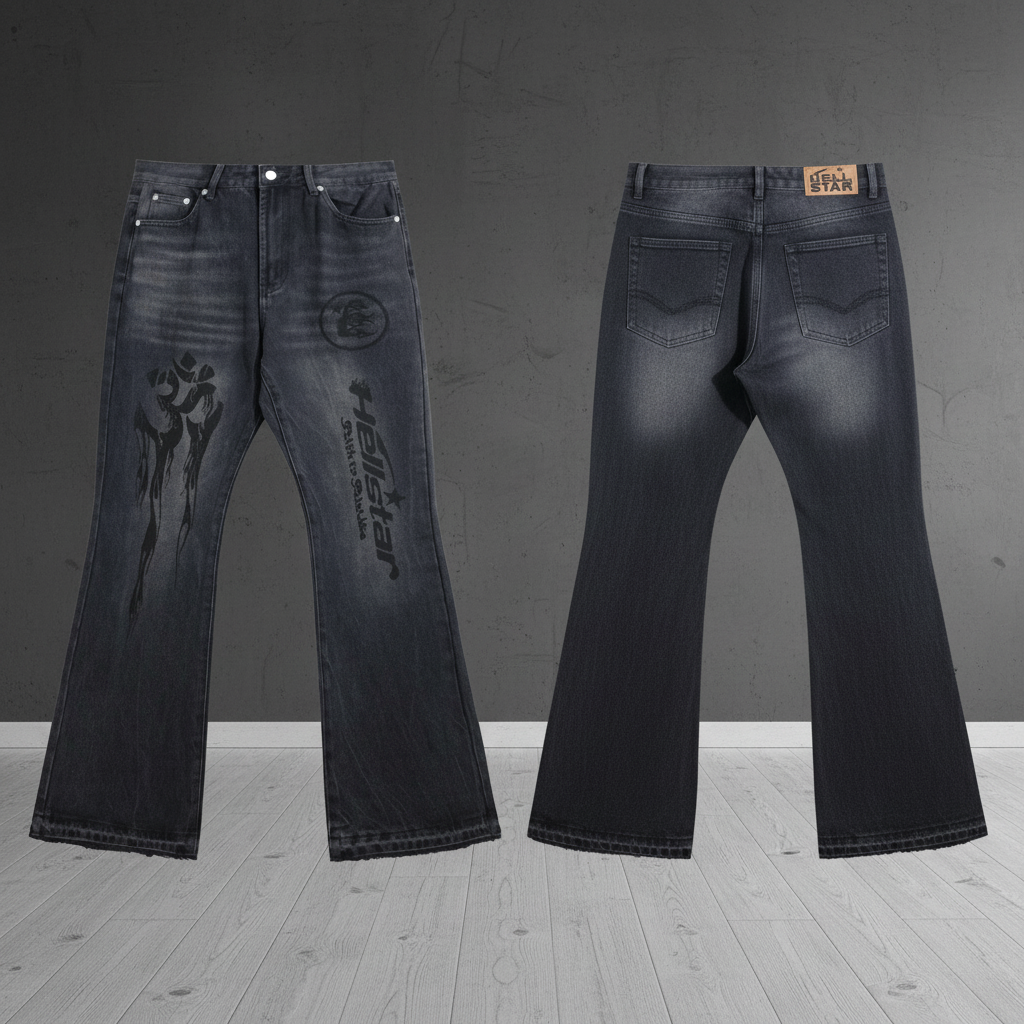 Hellstar Vintage Black Flare Jeans Unisex Retro Logo Streetwear