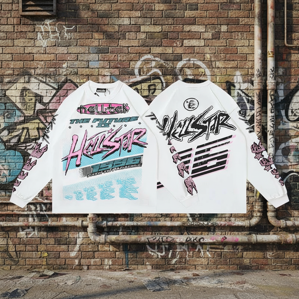 Hellstar Washed White Cotton Long Sleeve Graphic Tee