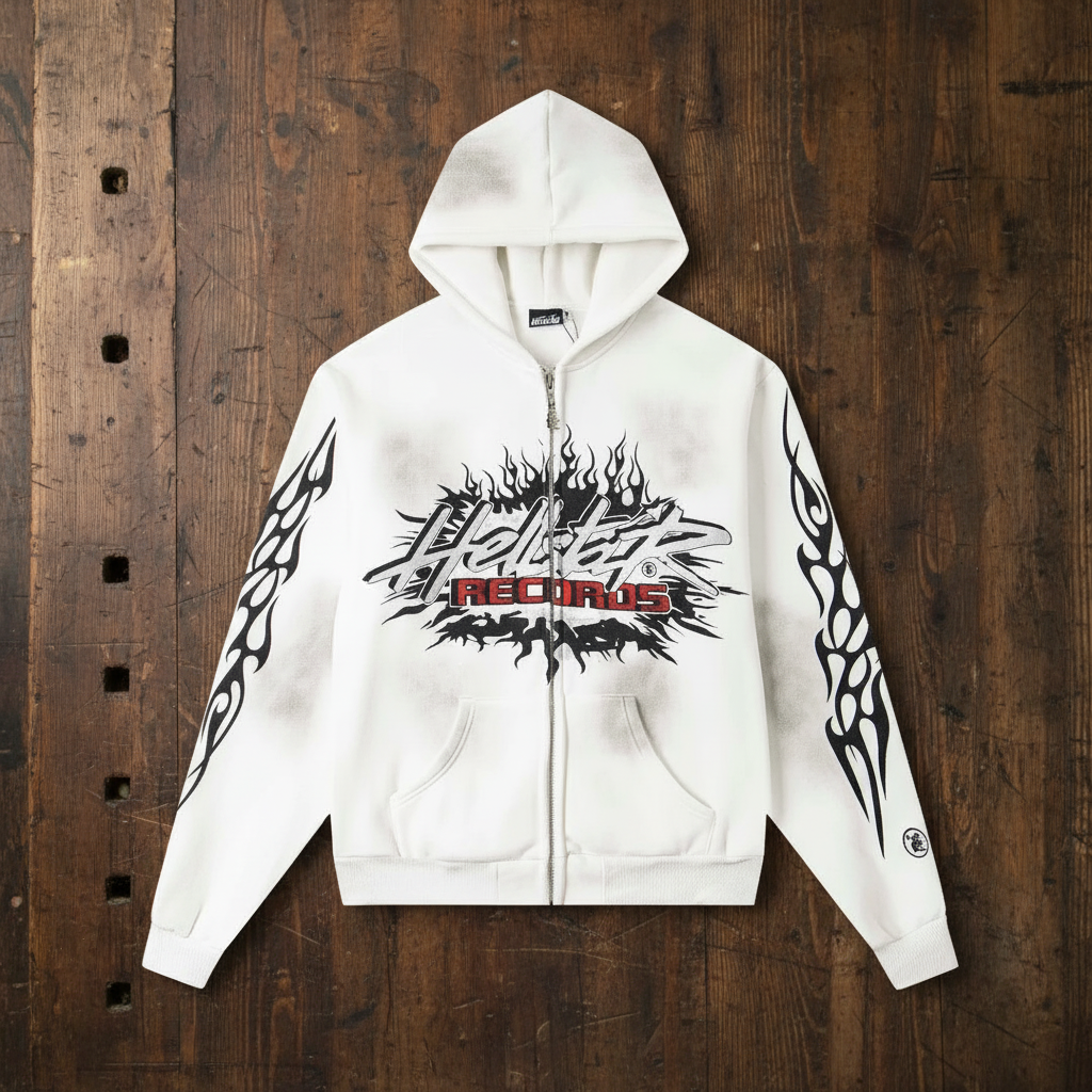 Hellstar White Fleece Hoodie – Vintage Wash, Zip Front, Unisex Streetwear
