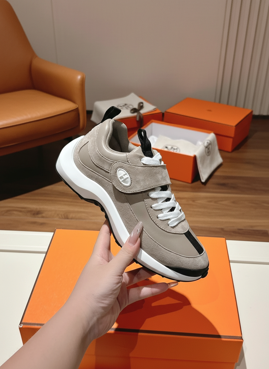 Hermes beige suede leather sneakers with white laces, luxury casual footwear featuring iconic logo detail, stylish comfort for everyday wear.
