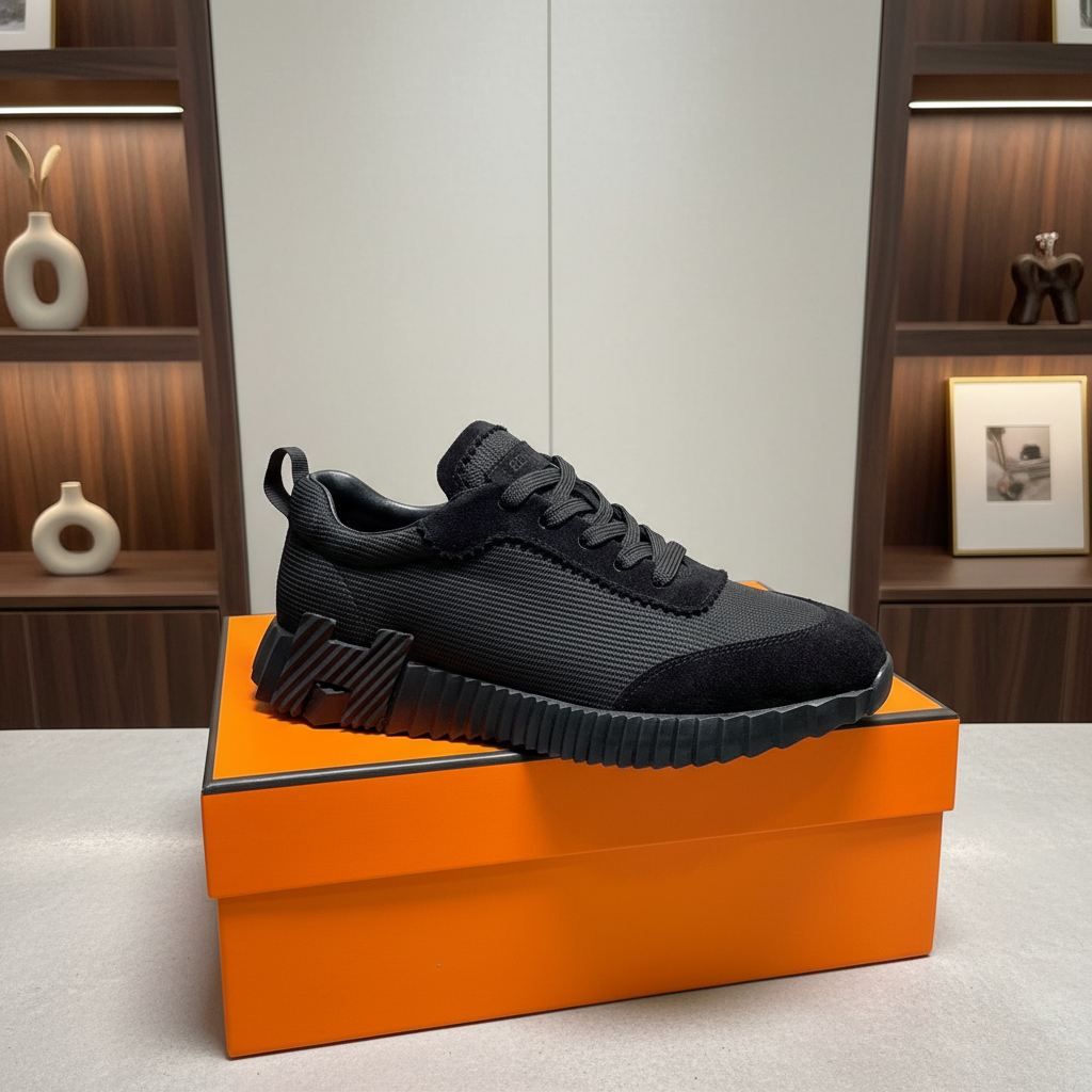 Hermes Black Sneakers, premium suede and mesh design, lightweight sole, stylish and comfortable for casual or sport wear, perfect luxury footwear choice.