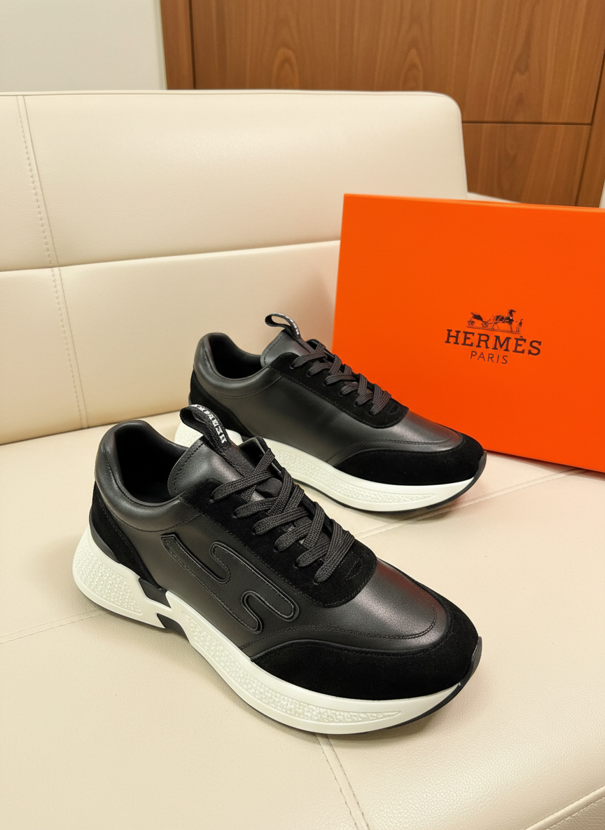 Hermes Paris black leather sneakers with chunky white sole, stylish lace-up design, premium comfort and luxury craftsmanship for men’s fashion.