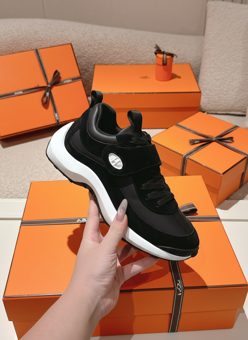 Hermes black luxury sneakers with suede and leather accents, breathable design, and comfortable sole, perfect for casual wear and fashion-forward looks.