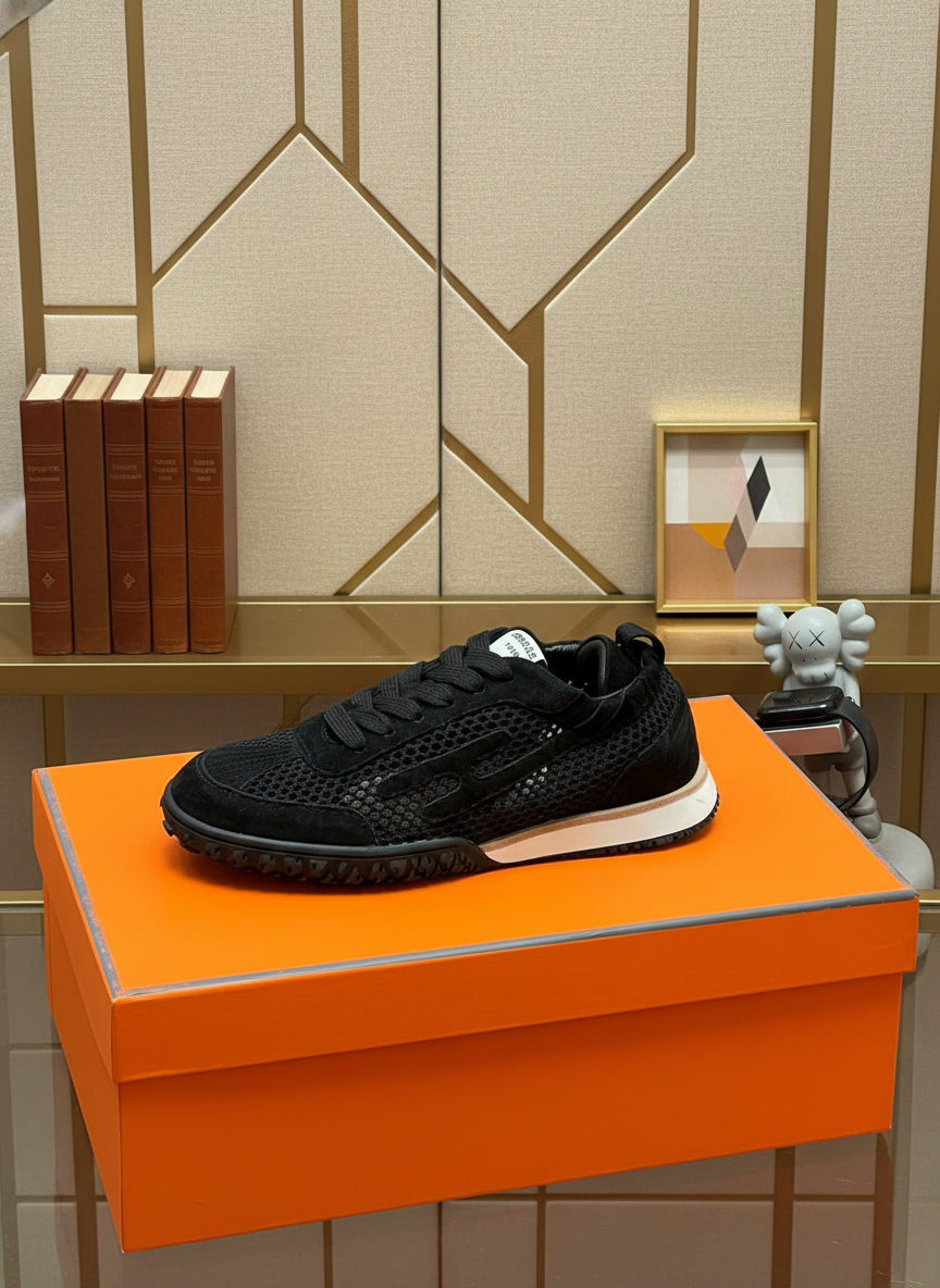 Hermes Black Mesh Sneakers with suede accents, lightweight design, and rubber sole for superior comfort and style, perfect for casual wear or luxury sports fashion.