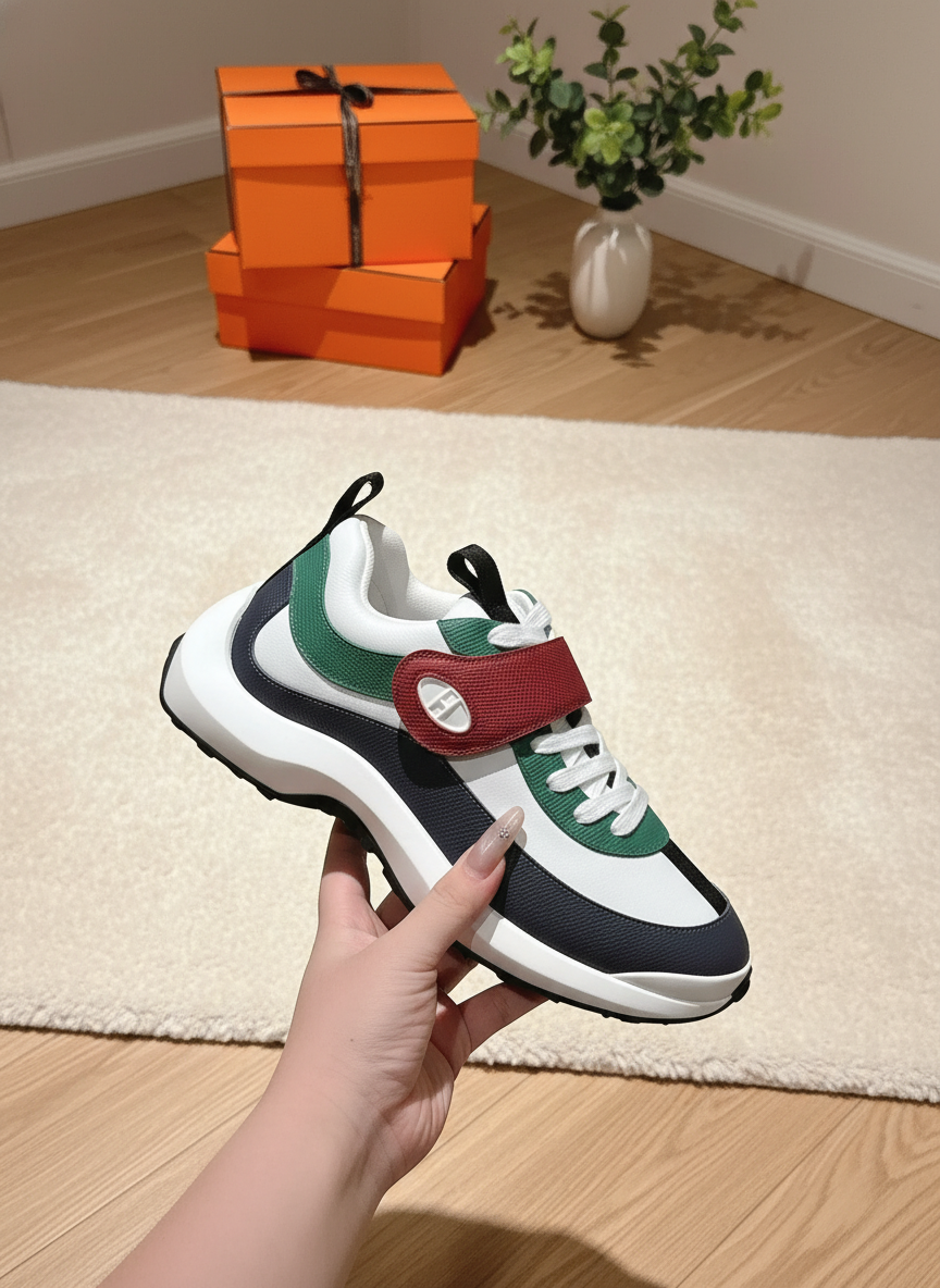 Hermes men’s luxury sneakers, stylish color-block design with green, red, and navy accents, premium materials, perfect for casual and sporty looks.
