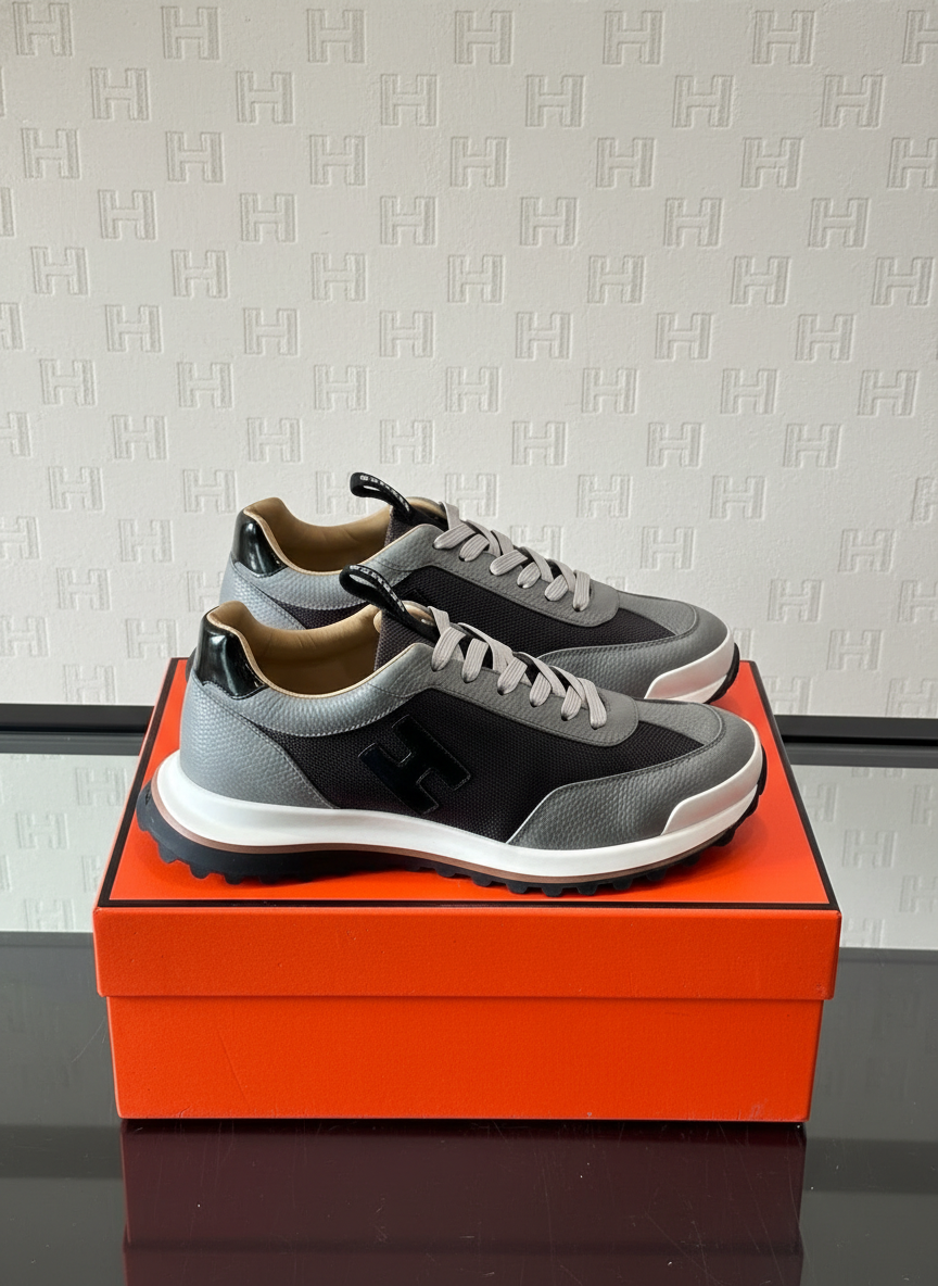 Hermes men’s grey and black leather sneakers, stylish casual design, durable sole, perfect for everyday wear and luxury fashion lovers.