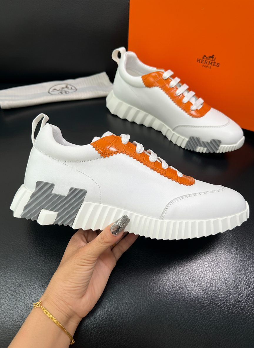 Hermes Paris white leather sneakers with orange accents, chunky sole, and iconic H detail, offering luxury style and comfort for fashion-forward looks.
