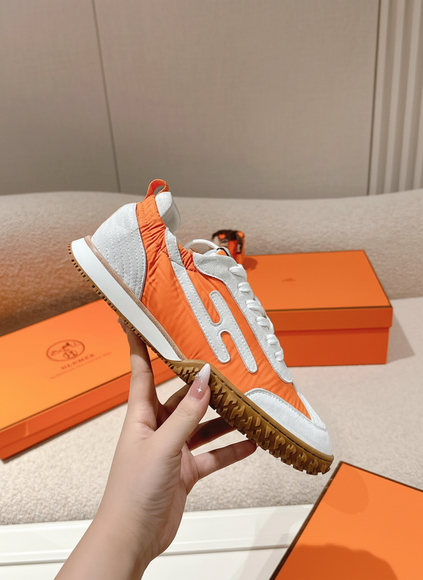 Hermès orange and white luxury sneakers with suede accents, durable rubber sole, and sporty design for stylish comfort and premium quality.