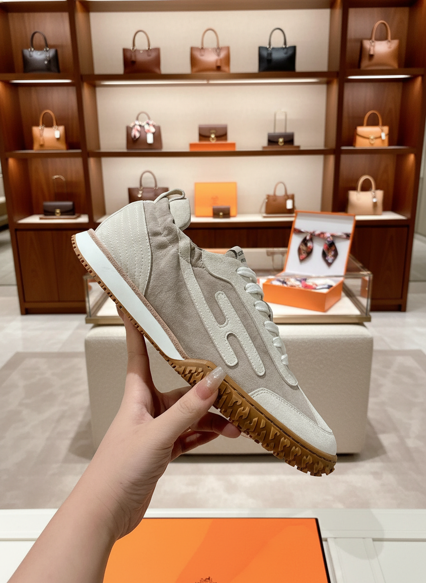 Hermes luxury suede sneakers with white accents and textured rubber sole, offering premium comfort, style, and durability for everyday wear or casual outings.