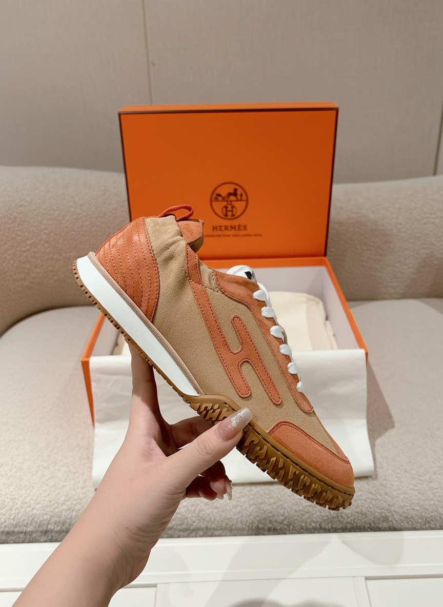 Hermes Suede Leather Orange Brown Sneakers Shoes