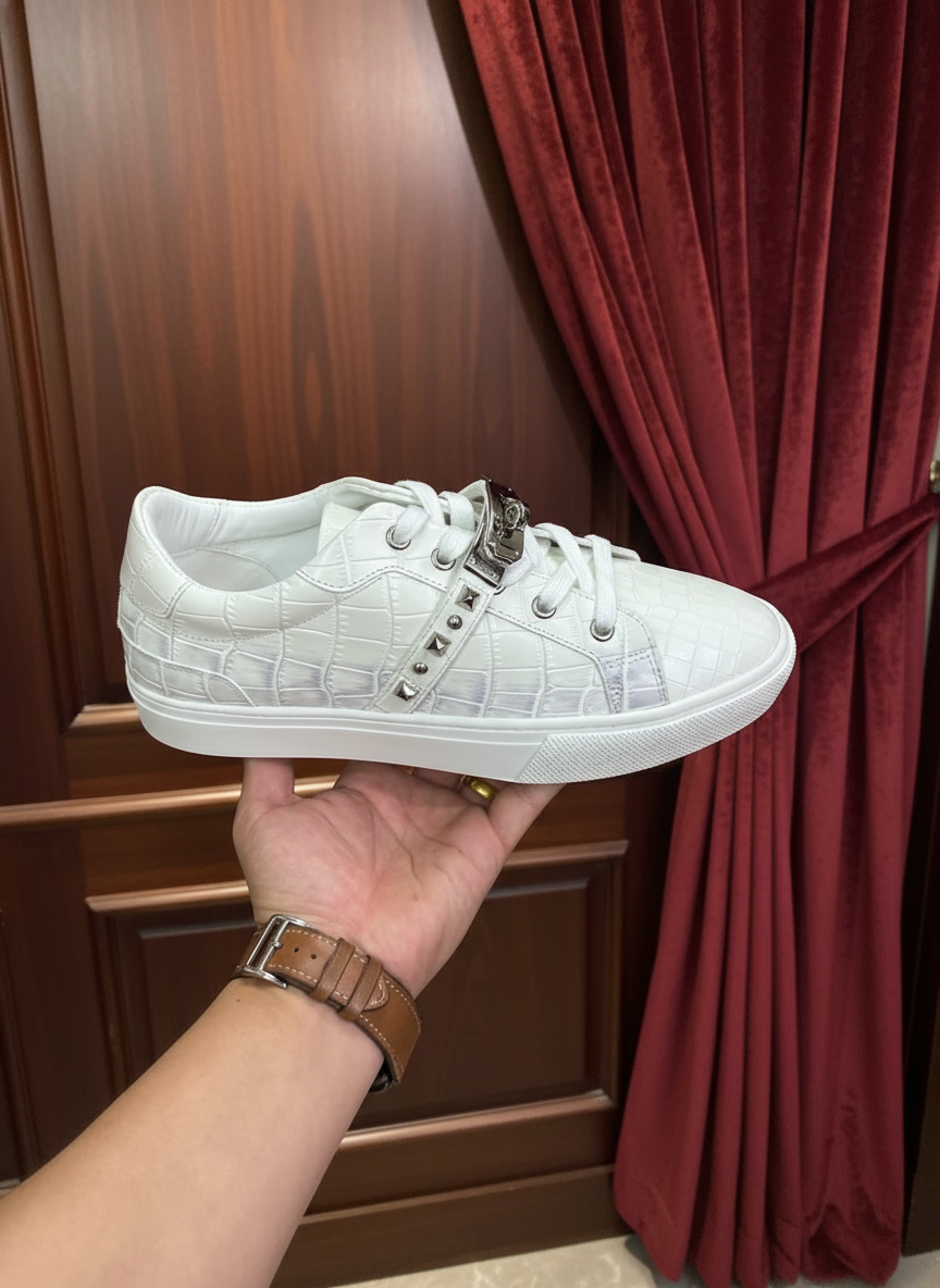 Hermes White Crocodile Pattern Leather Sneakers with Metal Buckle Detail, Luxury Designer Casual Shoes for Men and Women