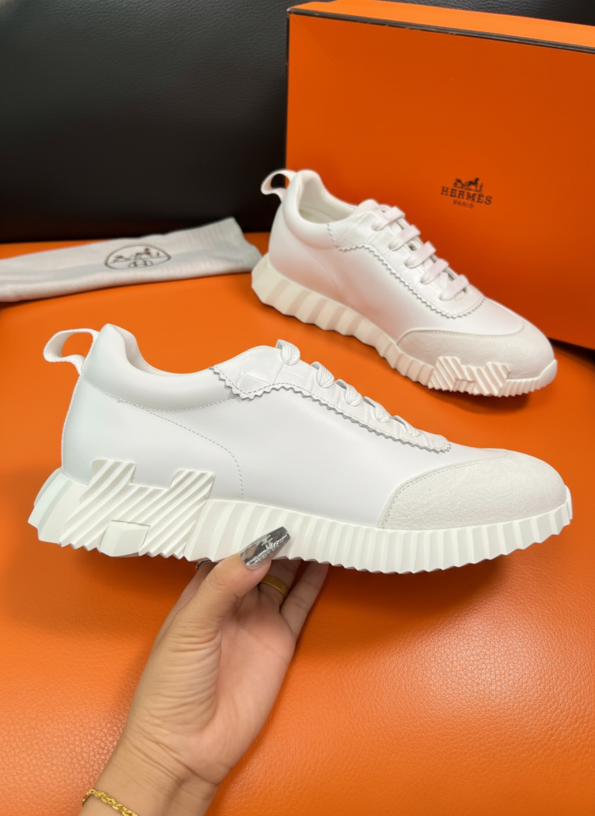 Hermes White Leather Sneakers with unique textured sole, stylish modern design, perfect for casual wear and luxury fashion lovers seeking comfort and elegance.