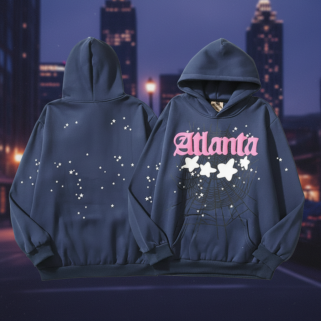 HoodiesRevenge Atlanta Graphic Hoodie, Navy Blue Pullover with Star and Spider Web Print, Cozy Streetwear for Men and Women.