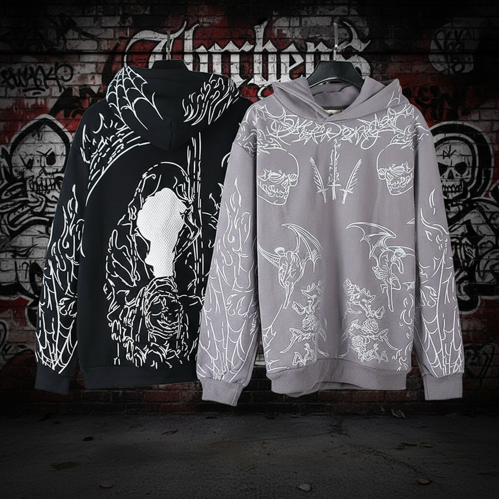 HoodiesRevenge graphic streetwear hoodies with gothic skull and wing prints, loose fit, casual unisex style, perfect for hip hop fashion and autumn winter wear.