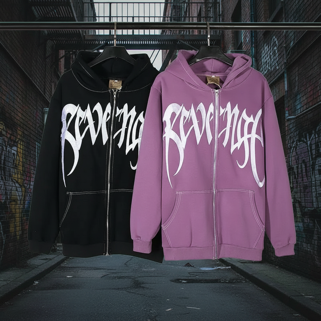 HoodiesRevenge Gothic Zip Up Hoodie, Streetwear Style, Casual Comfort, Bold Letter Print, Unisex Fashion, Black or Purple, Perfect for Autumn and Winter
