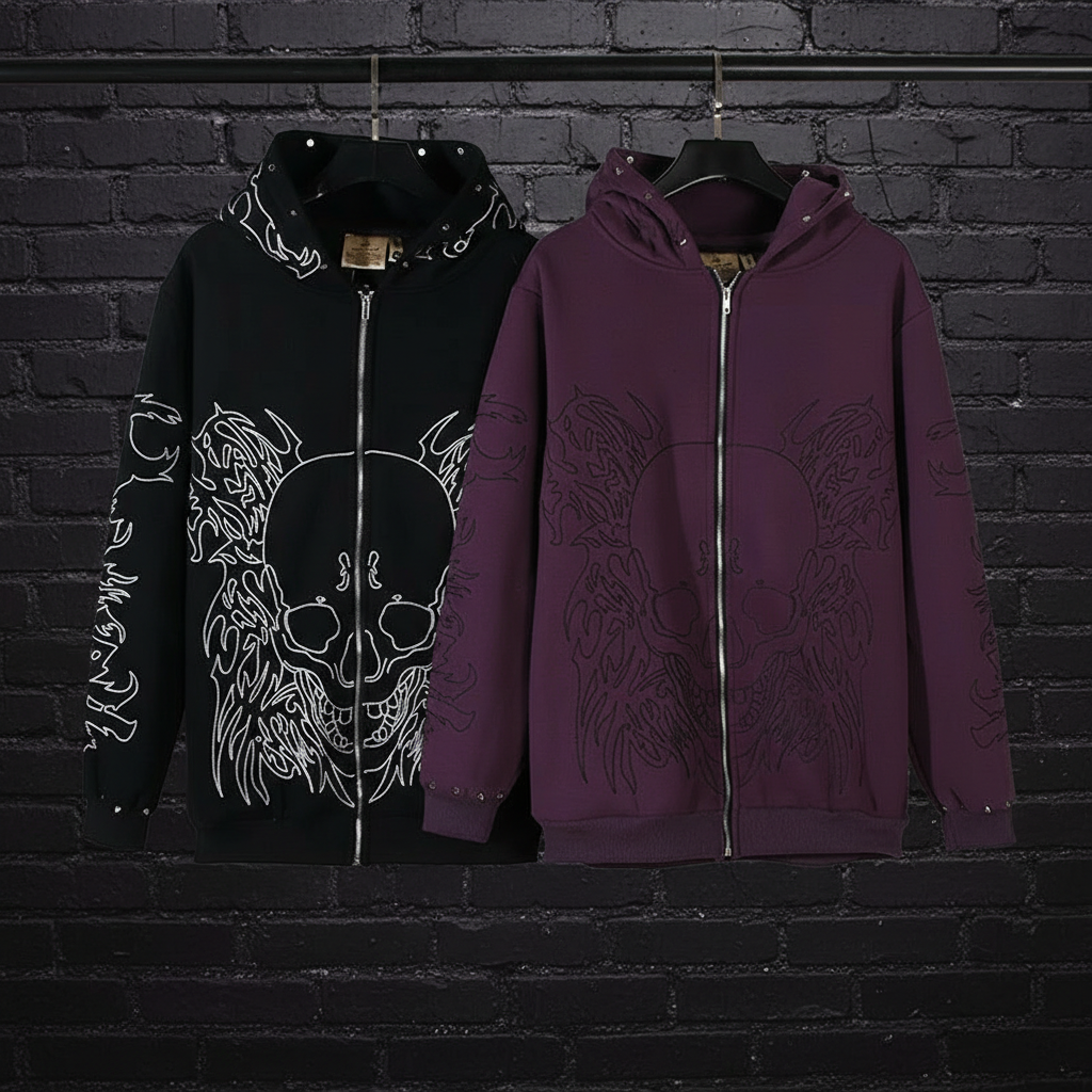 HoodiesRevenge skull flame zip-up hoodie, streetwear style, available in black or purple, perfect for casual wear and edgy fashion lovers.