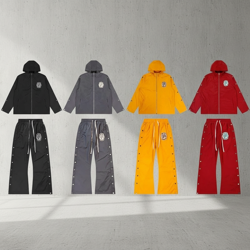 JacketsSaint sporty hooded jacket and snap pants set, breathable and lightweight, available in black, gray, yellow, red for casual wear or outdoor activities.