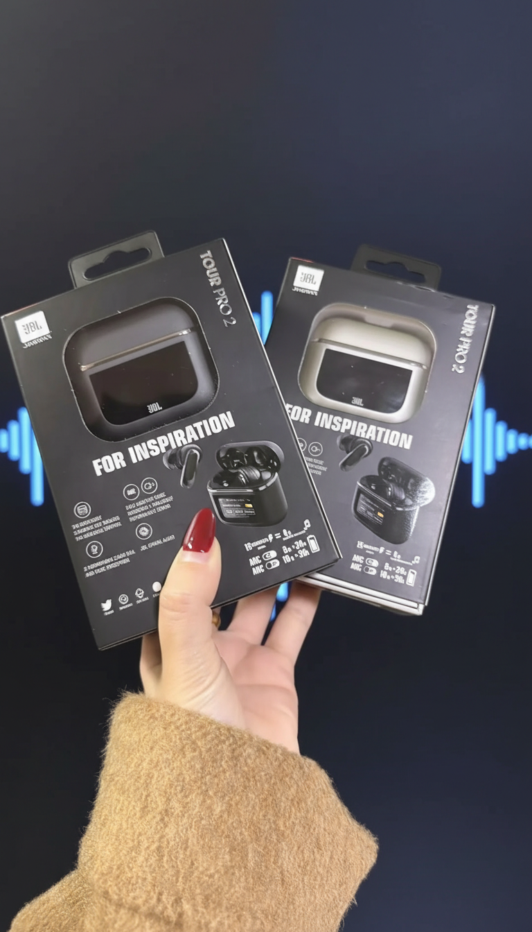 JBL Tour Pro 2 wireless earbuds with smart display case, ANC, superior call quality, immersive sound, and up to 40 hours playtime for ultimate audio experience.