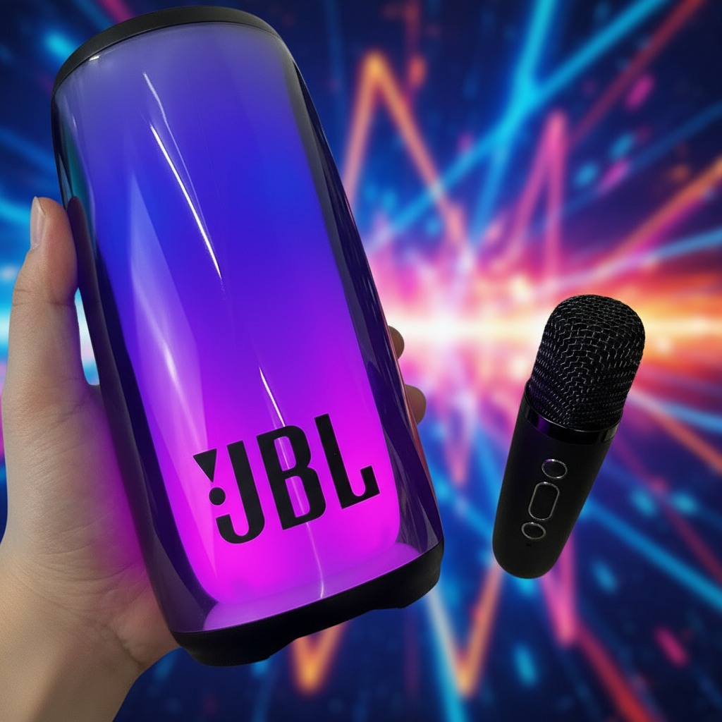 JBL Bluetooth Speaker with dynamic RGB lights and wireless microphone, delivering powerful sound for parties, karaoke, and outdoor entertainment.