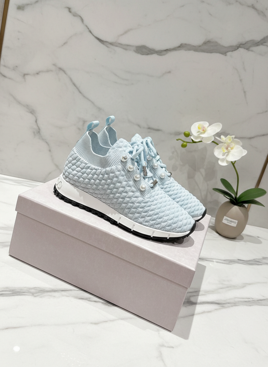 Jimmy Choo light blue textured knit sneakers with pearl accents, lightweight sole, and chic design for stylish casual wear and all-day comfort.