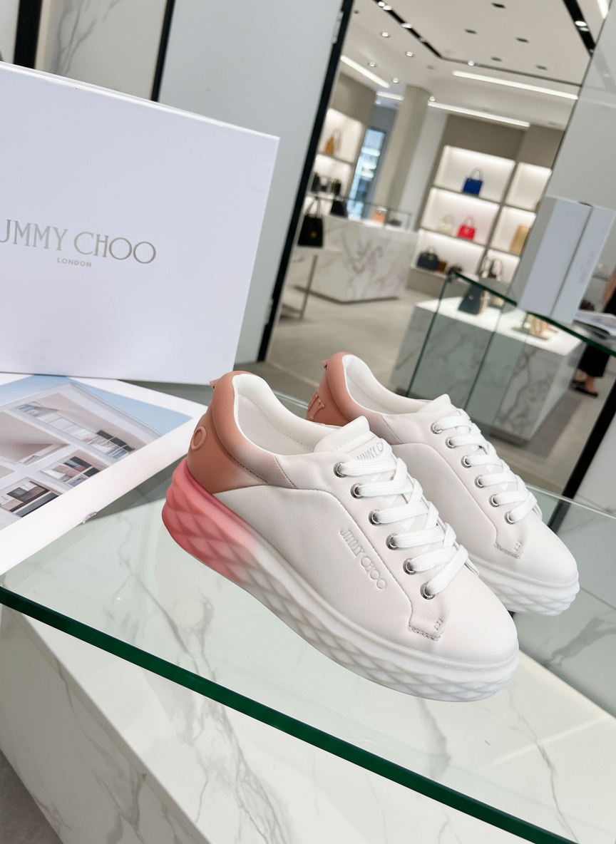 Jimmy Choo women’s white leather sneakers with pink gradient sole, stylish casual design, perfect for chic everyday wear and comfortable walking.