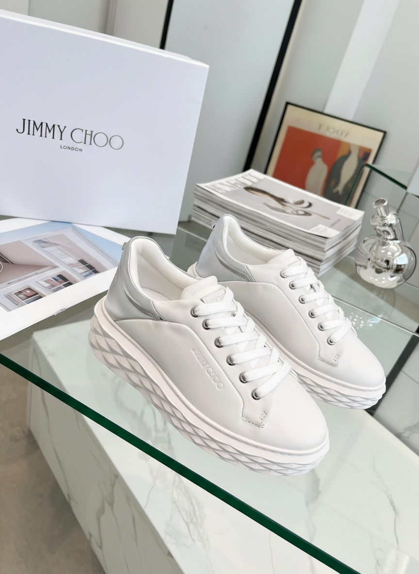 Jimmy Choo white leather sneakers with textured platform sole, stylish design, premium comfort, perfect for casual or chic outfits.