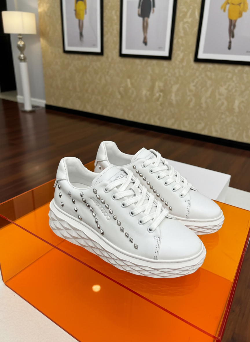 Jimmy Choo white leather sneakers with silver stud accents, featuring a stylish textured sole for a luxe, modern look perfect for casual and trendy outfits.